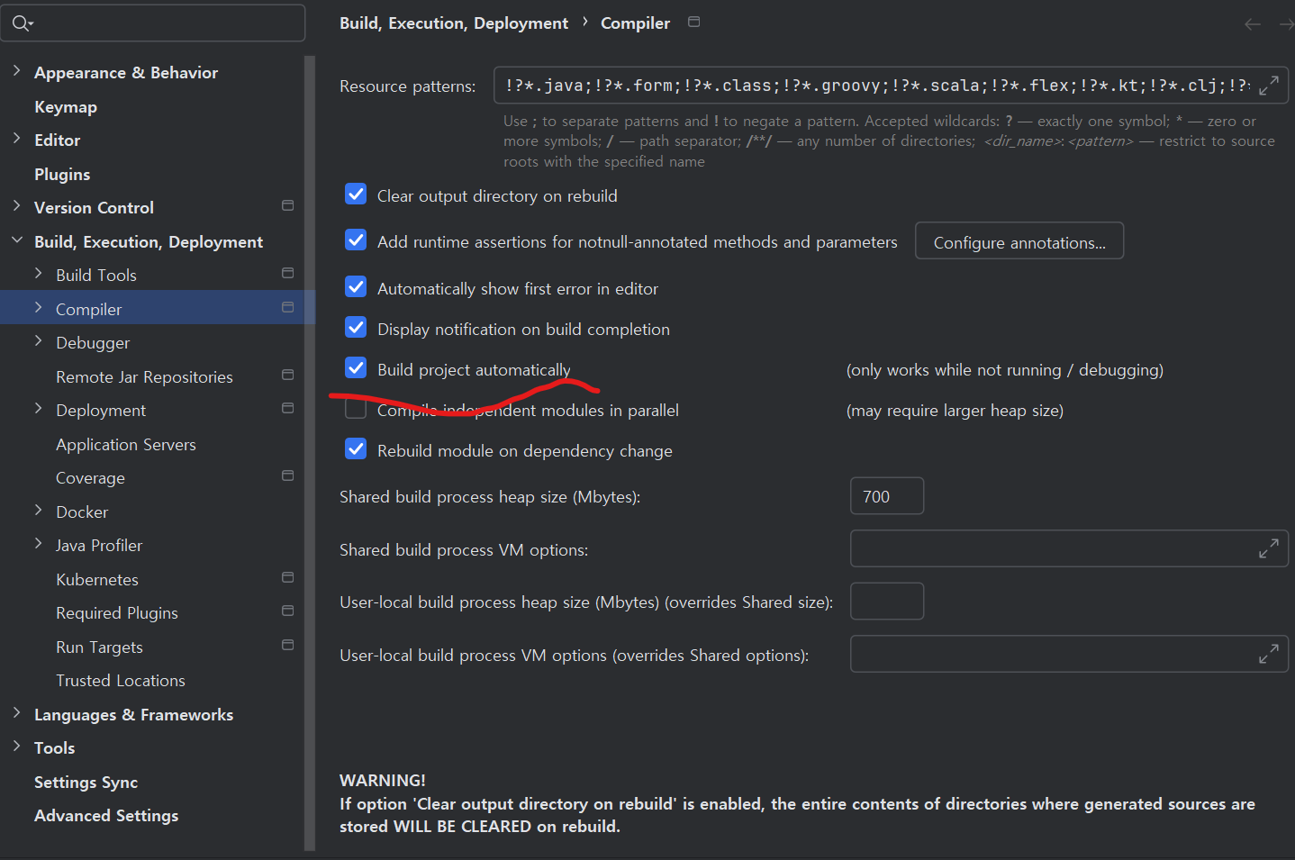 Build, Execution, Deployment - Compiler - Build project automatically 체크