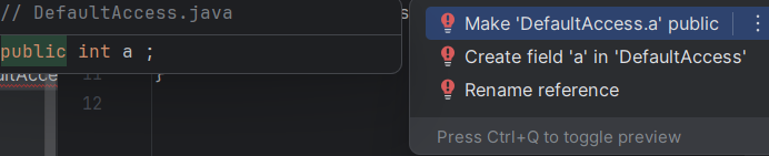 반면, 아래의 코드는 defaultAccess.a = 50; 부분에서 컴파일 에러가 발생한다.